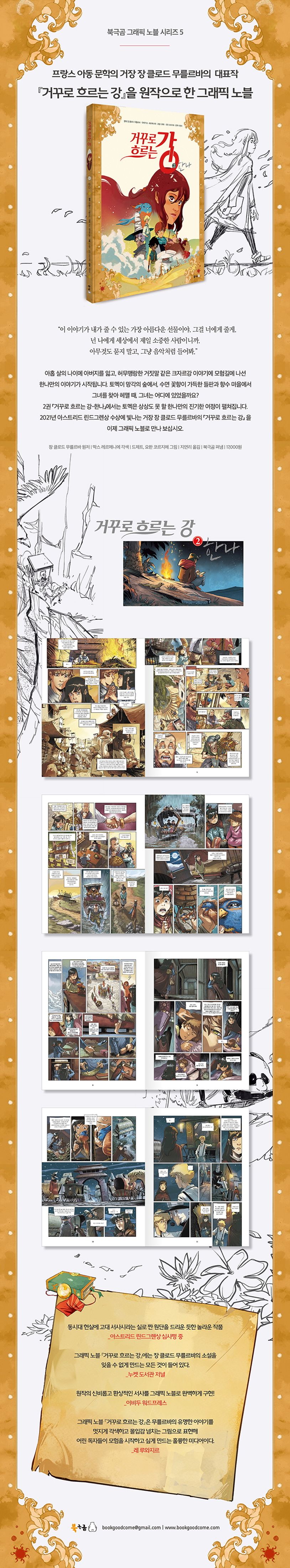 게임 스토리의 원조 소설로도 불리는 장 클로드 무를르바의 『거꾸로 흐르는 강』은 20년이 지난 지금도 유럽 청소년, 대학생의 필독서이며, 50만부 이상 팔린 베스트셀러이자 현대판 고전입니다. 현재 애니메이션으로도 제작 중인 이 소설은 무를르바 특유의 상상력과 심오함이 잘 드러나는 대표작으로 설화와 전설의 세계로 떠나는 모험 여행을 그리고 있습니다. 이번에 출간되는 그래픽 노블 『거꾸로 흐르는 강』은 그 여행에 동참할 수 있는 또 한 장의 티켓입니다. 프랑스 현지에서는 출간과 동시에 원작의 세계를 뛰어난 구성과 시각 연출로 완벽하게 구사했다는 호평과 많은 매체의 주목을 받은 바 있습니다.