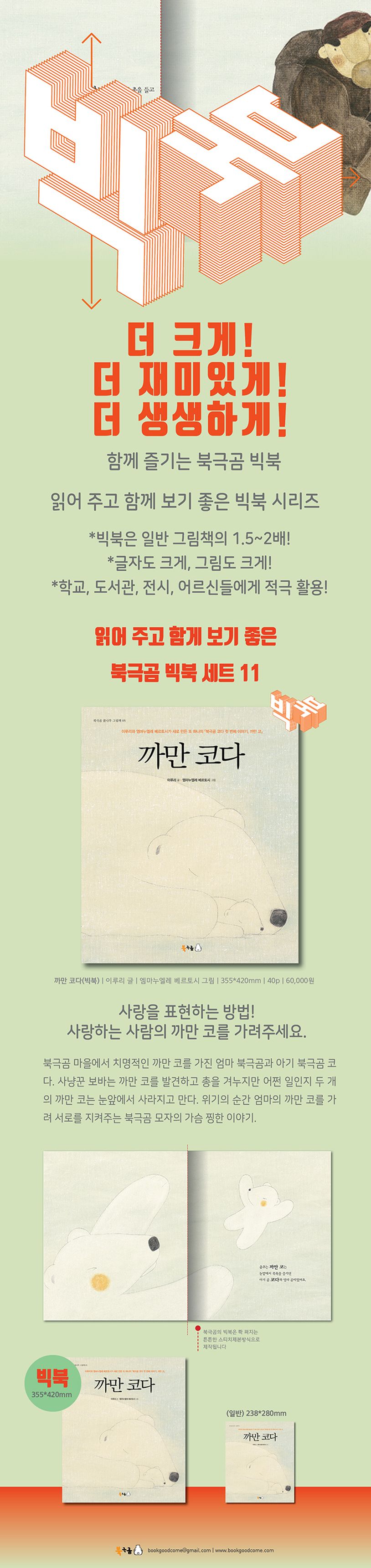 독자들에게 사랑받는 북극곰 그림책이 빅북(Big Book)으로 출간되었습니다. 빅북(Big Book)은 일반 그림책보다 1.5~2배 정도 크게 만든 체험형 그림책입니다. 글자도 커지고, 그림도 커져서 재미와 감동을 더 생생하게 느낄 수 있습니다. 원본 그림책의 비율을 그대로 살린 커다란 판형의 책으로 학교나 도서관에서 읽어 주기 좋고 함께 보기에도 좋습니다. 그밖에 전시, 독서 치료, 어르신들에게 그림책 읽어 주기 등에 적극 활용할 수 있습니다.
