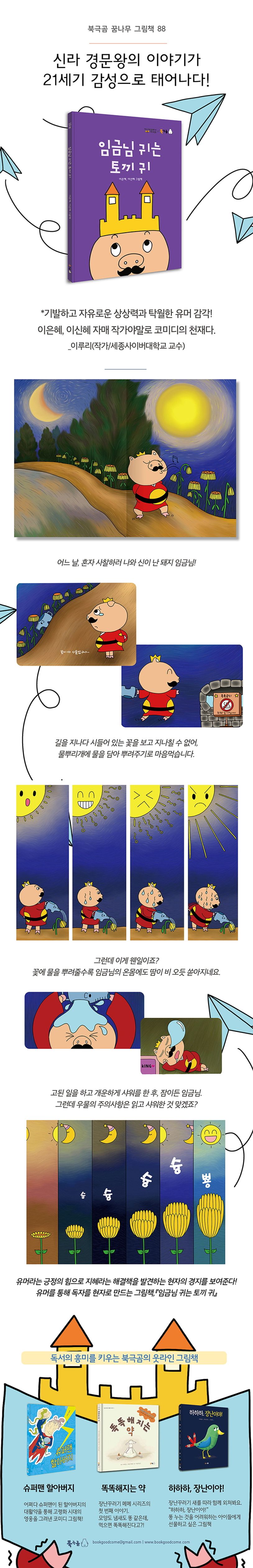 이제 토끼 귀가 된 돼지 임금님에게는 어떤 일이 벌어질까요? 『임금님 귀는 토끼 귀』는 옛이야기 『임금님 귀는 당나귀 귀』를 패러디하여 패러디의 진수를 보여 주는 아주 통쾌한 그림책입니다.