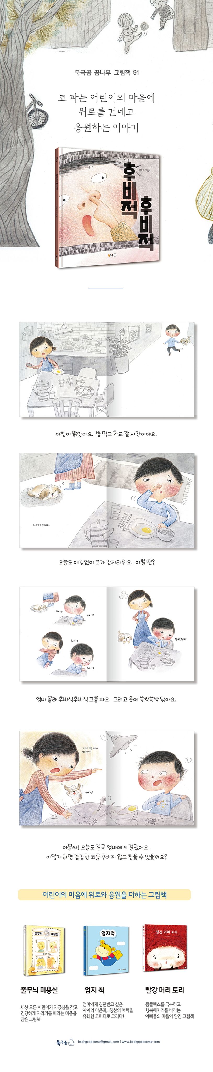 둥이는 콧속이 자주 가렵습니다. 그래서 코를 파지요. 오늘 아침에도 식탁에서 코를 후비적후비적 파고 코딱지를 옷에 쓱싹쓱싹 닦다가 엄마한테 딱 걸렸습니다. 둥이는 아침부터 엄마한테 야단을 맞고 옷을 갈아입은 후에야 엄마 차에 탑니다. 그런데 차에 타니 또 콧속이 갑갑합니다. 과연 둥이는 가렵고 갑갑한 코를 참을 수 있을까요? 그림책 『후비적후비적』은 여러 동화책에서 따뜻하고 독특한 일러스트레이션으로 주목받고 있는 변보라 작가의 신작입니다!