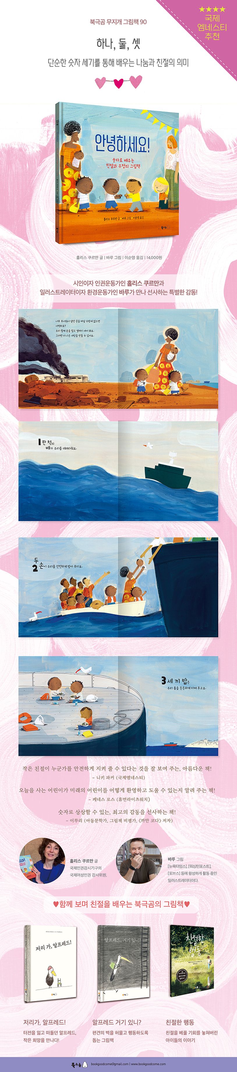 《안녕하세요!》는 위험한 곳에서 탈출한 가족을 돕는 여러 방법을 보여줍니다. 세상 모든 어린이들에게 친절과 희망을 선사하는, 특별하고 아름다운 숫자 그림책입니다, 시인이자 세계적인 인권운동가인 홀리스 쿠르만이 쉽고 아름답고 강력한 이야기를 썼습니다. 더불어 세계적인 일러스트레이터이자 환경운동가인 바루가 따뜻한 그림으로 특별한 감동을 선사합니다. 《안녕하세요!》는 숫자로 상상할 수 있는, 최고의 감동을 선사하는 그림책입니다.