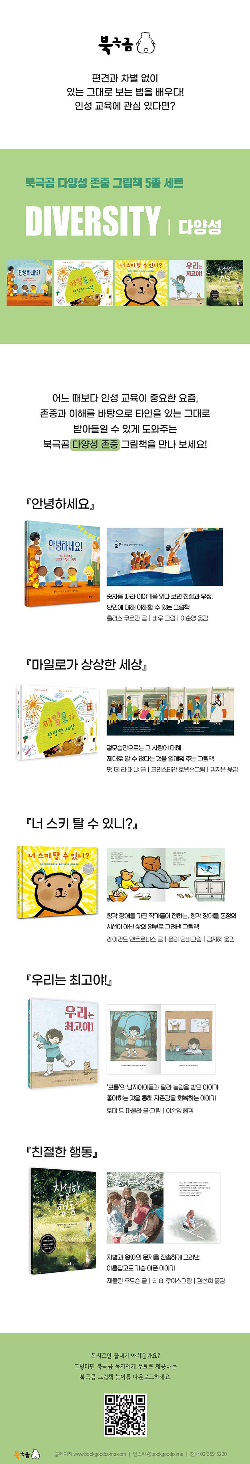 청각 장애를 동정의 시선이 아닌 삶의 일부로 그려낸 『너 스키 탈 수 있니?』, 겉모습만으로는 그 사람의 이야기를 제대로 알 수 없다는 것을 상상력 가득한 마일로의 그림을 통해 담아낸 『마일로가 상상한 세상』, 하나 둘 셋 숫자를 따라 이야기를 읽다 보면 난민에 대한 이해가 깊어지며, 눈시울이 붉어지는 『안녕하세요!』, 남자아이지만 운동을 좋아하지 않는 우리가 탭댄스를 배우게 되면서 일어나는 놀라운 변화를 보여주는 『우리는 최고야!』, 차별과 왕따의 문제를 진솔하게 그려낸 아름답고도 가슴 아픈 이야기 『친절한 행동』. 북극곰 다양성 존중 그림책 세트는 이처럼 다양한 이야기들을 통해 아이들이 세상을 열린 마음으로 바라볼 수 있게 해 줍니다. 우리 아이들에게 배려와 존중의 태도를 길러주고 자신과 다른 사람들을 너그럽게 받아들일 수 있도록 도와주는 북극곰의 다양성 존중 그림책 세트를 만나 보세요.