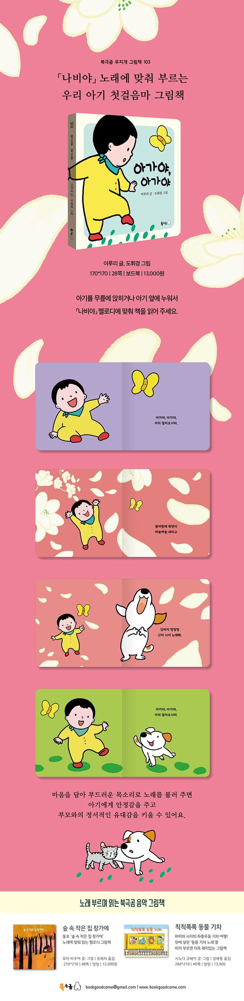 『아가야, 아가야』는 동요 「나비야」를 개사하여 만든 그림책입니다. 꽃비 내리는 봄날 누군가 아기를 부릅니다. ‘아가야, 아가야, 이리 걸어오너라.’ 노래에 맞춰 흥얼거리며 책장을 넘기다 보면 저절로 엄마 미소가 지어집니다. 이제 막 걸음마를 떼기 시작한 아기가 나비를 따라 걸으며 강아지도 만나고 고양이도 만납니다. 색색의 예쁜 꽃들도 봄바람에 휘날리며 아기의 걸음마를 응원하는 듯합니다. 아기가 첫걸음마를 떼는 감동의 순간은 엄마와 아기 모두에게 기쁨과 행복을 가져다줍니다. 아장아장 걸어 나가는 아기가 마침내 엄마 품에 안겨 미소 짓는 사랑스러운 그림책 『아가야, 아가야』로 마음에 포근함을 더해 보세요.