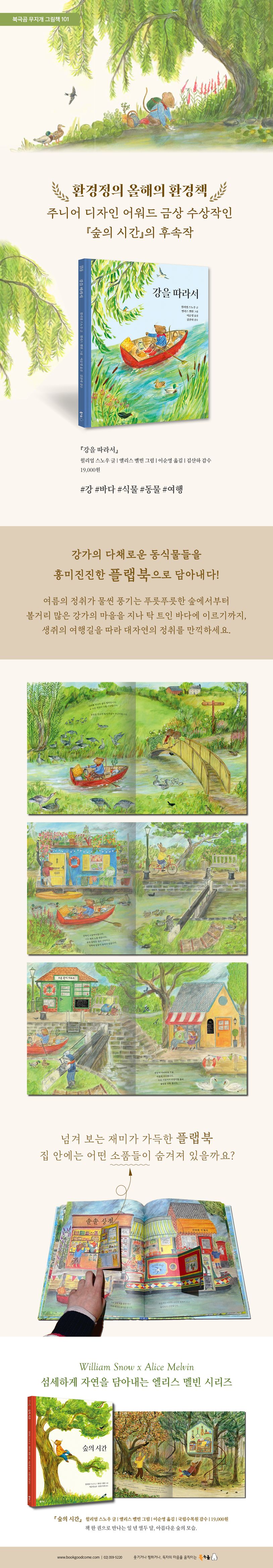 『강을 따라서』는 일 년 열두 달 아름다운 숲의 모습을 담아낸 『숲의 시간』의 후속작입니다. 강을 따라 바다에 이르는 생쥐의 여정을 운율감 있는 문체와 섬세하고 부드러운 수채화로 담아냈습니다. 전작에서 시시각각 달라지는 숲의 사계절을 그려냈다면 이번에는 강에서 바다에 이르는 생쥐의 여행을 따라 다채로운 동식물과 아름다운 풍경을 만나볼 수 있습니다. 여름의 정취가 물씬 풍기는 푸릇푸릇한 숲에서부터 볼거리 많은 강가의 마을을 지나 탁 트인 바다에 이르기까지, 생쥐의 여행길을 통해 대자연의 정취를 만끽할 수 있는 그림책입니다.