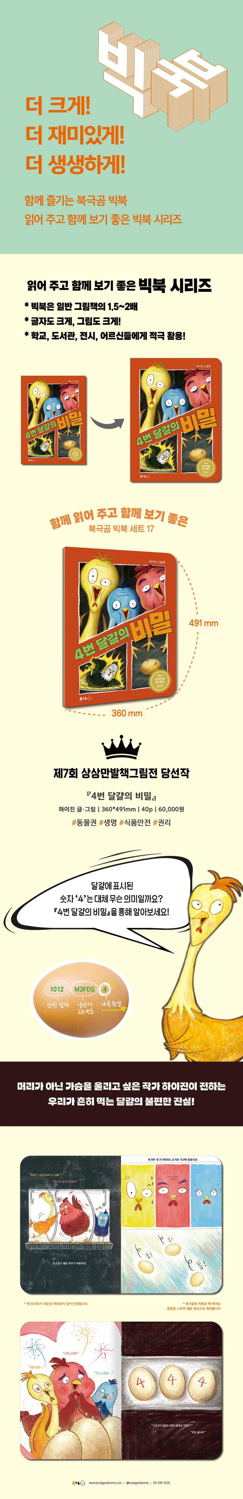 평생 작은 집에서 함께 살아온 세 마리 닭, 어느 날 문득 자신들이 낳은 달걀은 왜 모두 4번이라고 적혀 있는지 궁금해합니다. 그때 낯선 닭이 찾아와 4번 달걀의 비밀을 알려 주려다 누군가에게 잡혀갑니다. 도대체 4번 달걀의 비밀은 무엇일까요?