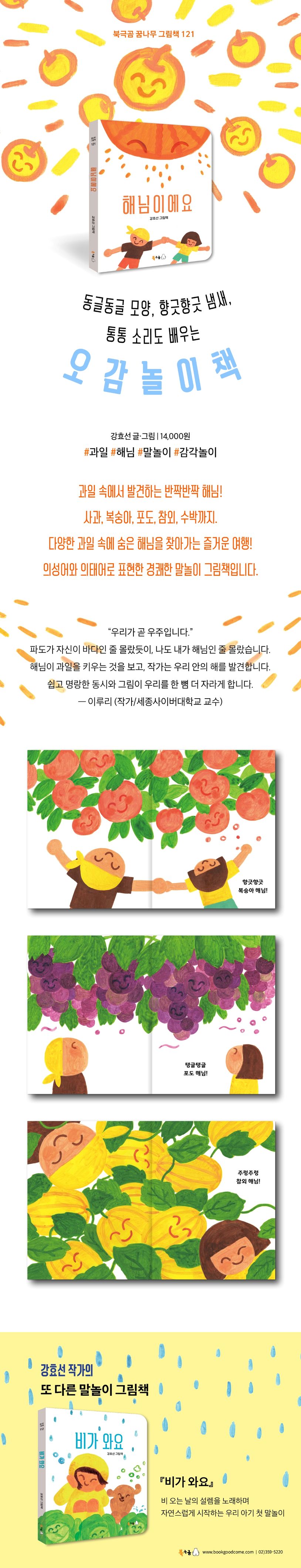 해님이에요./반짝반짝 사과 해님!/해님이에요./향긋향긋 복숭아 해님!/해님이에요./탱글탱글 포도 해님!/해님이에요./주렁주렁 참외 해님!/해님이에요./어떤 해님일까요?/와~ 내가 제일 좋아하는/수박 해님이에요!/해님이에요./달콤한 해님이에요.