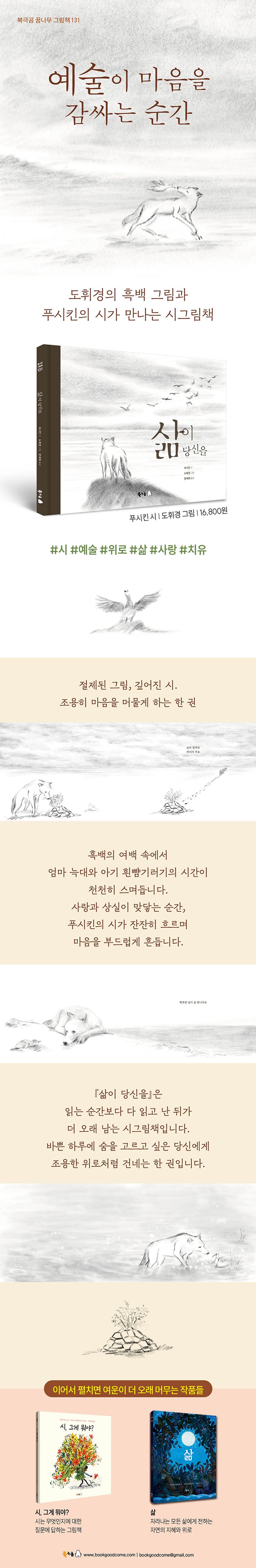 도휘경 작가의 세 번째 시 그림책. 가혹한 자연 속에서 아기를 잃은 엄마 늑대, 그리고 살아남기 위해 절벽에서 뛰어내려야 하는 아기 흰뺨기러기. 이들의 아이러니한 운명을 통해 작가는 사랑이 어떻게 삶을 완성하는가를 그려냈습니다. 그림 이야기를 먼저 완성한 후 푸시킨의 시 『삶이 당신을』을 얹음으로써, 두 예술이 완벽하게 조화를 이루었습니다. 마치 오래전 푸시킨이 이 그림책을 위해 시를 써 둔 것처럼 『삶이 당신을』은 예술이 경계를 넘어 인간의 마음을 잇는 순간을 보여줍니다. 고통도 행복도 함께 품은 삶을 따뜻하게 위로하는, 모든 세대를 위한 시그림책입니다.
