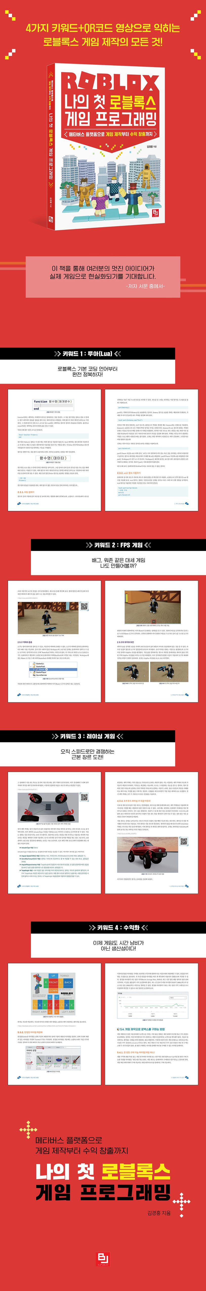 수많은 게임 플랫폼 중에서도 로블록스는 특별합니다. 다른 게임 제작 툴과 비교했을 때, 쉽고 편리하게좋은 퀄리티의 게임을 제작할 수 있기 때문입니다. 이 책은 게임 제작 툴에 대한 아주 기초적인 이론부터 게임 프로그래밍, 애니메이션, 특수 효과 등의 전문적인 내용까지 설명합니다. 또한 게임을 배포하고 수익까지 창출하는 법에 대해서도 알려주고자 합니다.