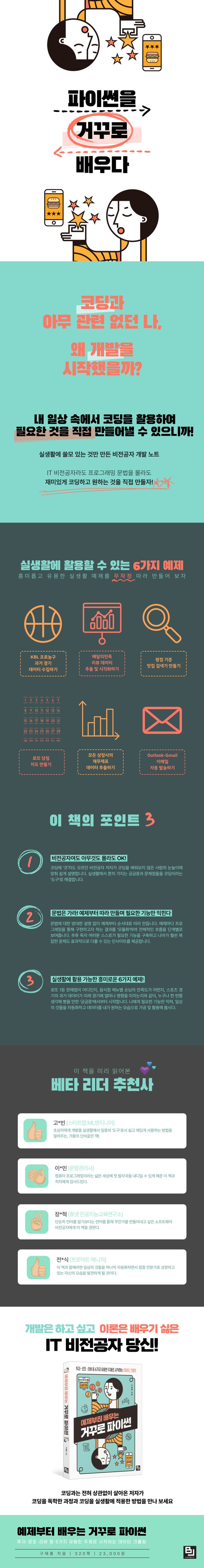 이 책은 독학으로 코딩을 공부한 저자가 만든 여섯 가지 파이썬 실생활 예제를 다룬다. 어렵고 불필요한 문법은 30분 만에 끝내고 ‘로또 당첨 지도’, ‘맛집 검색기’, ‘재무제표 추출’, ‘배달 앱 리뷰 시각화’, ‘이메일 자동화’, ‘스포츠 경기 과거 데이터 수집’과 같이 흥미롭고 유용한 예제를 무작정 따라 만들어 보도록 구성했다. 어려운 문법은 필요 없다! 나에게 필요한 기능만 익혀, 일상의 것들을 자동화하고 데이터를 내가 원하는 모습으로 가공 및 활용해 보자. 『예제부터 배우는 거꾸로 파이썬』과 함께라면 혼자서도 충분히 가능하다.