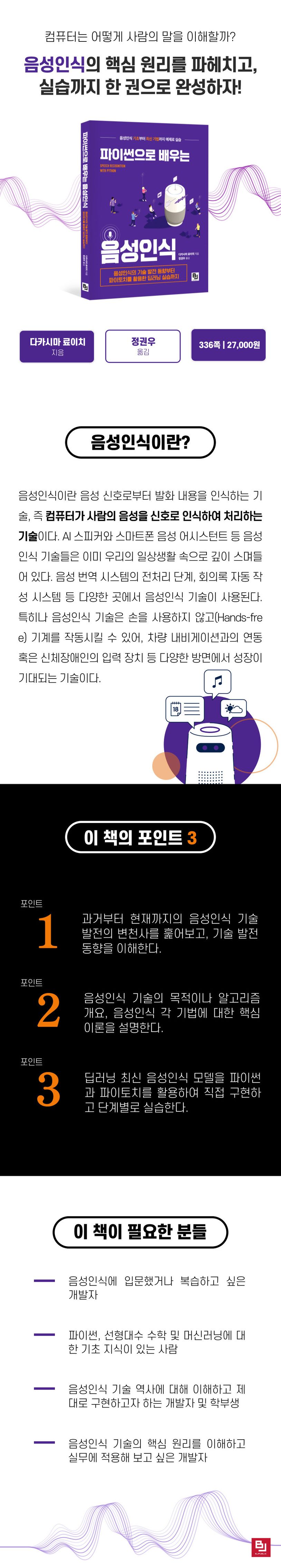 이 책은 지금까지의 음성인식 기술의 역사와 기술 발전 동향을 이해하고, 파이썬과 파이토치를 통해 최신 음성인식 시스템을 실습한다. 음성인식의 목적이나 알고리즘의 개요를 설명하고, 소스 코드를 상세하게 분석하고, 마지막으로 소스 코드를 첨부하여 독자들이 직접 구현할 수 있도록 한다. 특히 인공지능기술이 만들어진 목적이나, 해당 기술로 목적을 달성할 수 있을지에 대해 명확히 제시한다. 이 책은 음성인식을 제대로 구현하고자 하는 개발자 및 학부생에게 꼭 필요한 필독서가 될 것이다.