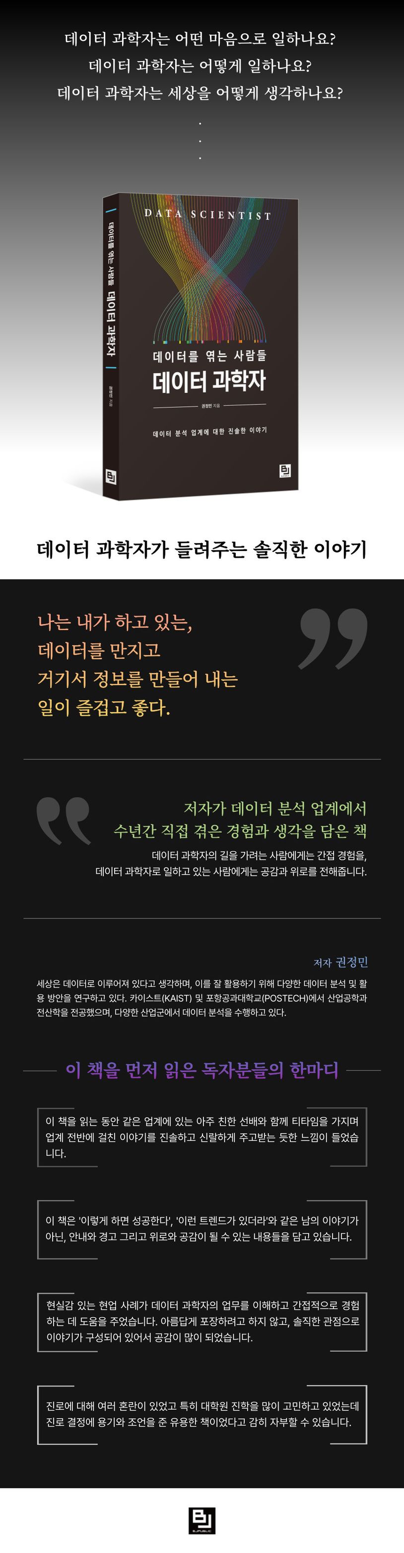 이제는 모든 분야에서 빅데이터를 활용할 정도로 빅데이터의 중요성이 높아졌다. 그만큼 데이터 분석 업계에 대한 관심도 많아지고 데이터 과학자가 되기 위해 준비하는 사람도 늘어났다. 데이터를 전문적으로 매일 다루는 데이터 과학자는 정확하게 무슨 일을 하는 사람일까? 수년간 데이터 분석 업계에 종사하며 겪은 저자의 경험과 생각을 이 책에 담았다. 마치 대화하듯 전해주는 저자의 이야기를 통해 데이터 과학자에 대해 이해해 보자.