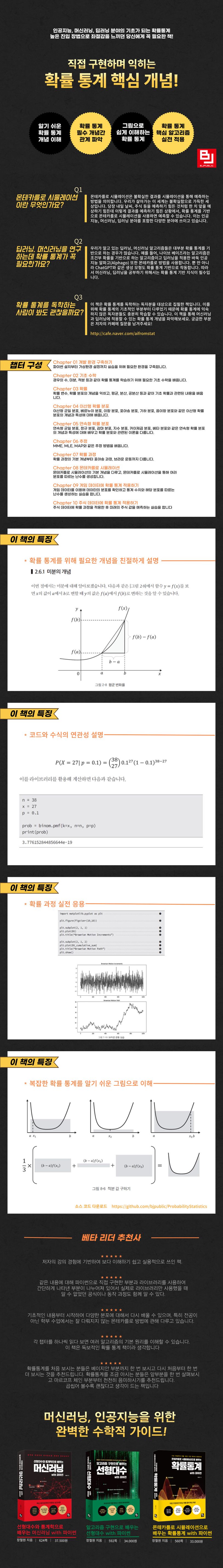 - 기초, 수학, 확률 분포, 확률 과정 등 확률 통계 필수 개념을 자세히 다룬다.