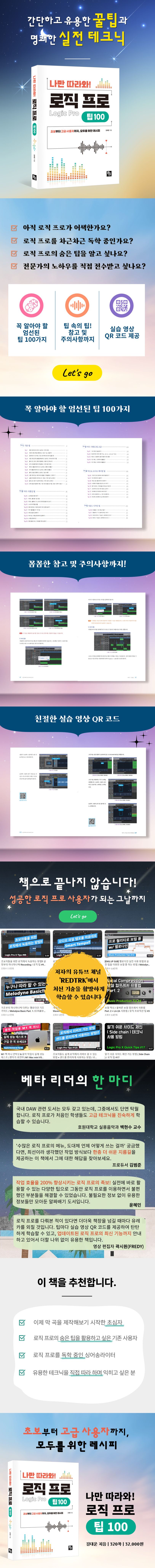 저자의 『나만 따라와! 같이 음악 만들자 feat. 로직 프로 10.6』에서 로직 프로의 전반적인 사용법과 하나의 음악을 완성해보는 과정을 다루었다면, 이 책에서는 로직 프로에서 작업할 때 꼭 알아야 하는 업선된 팁 100가지를 친절하게 안내합니다.