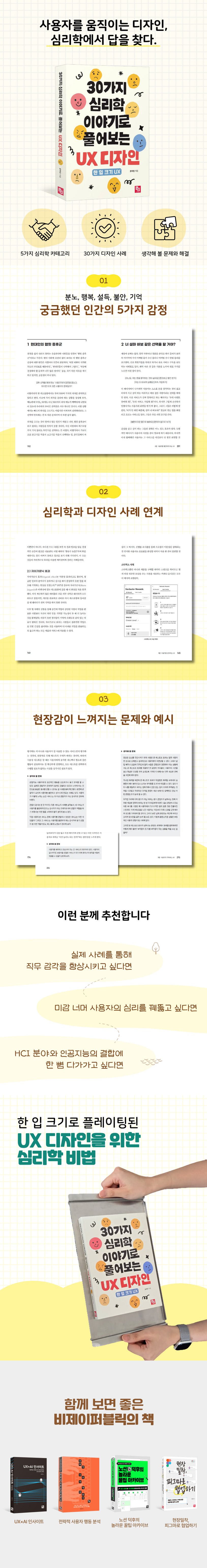 『30가지 심리학 이야기로 풀어보는 UX 디자인』에서는 인간의 감정과 행동을 분노, 행복, 설득, 불안, 기억이라는 다섯 가지 카테고리로 나누어 서비스 사례와 함께 엮습니다. 그리고 다양한 상황과 예시를 통해 현장감에 몰입하여 두 가지 학문을 접목해볼 수 있도록 돕습니다. 도구의 사용법이 아닌 UX 디자인의 본질을 탐구하며 어떤 백그라운드에서도 서비스 및 프로덕트와 인간 심리를 엮어내어 적용할 수 있도록 핵심을 꿰뚫습니다. 이 책과 함께 일상적인 사례로 쉽게, 하지만 사용자의 심층까지 통찰할 만큼 깊게 사용자 경험을 위한 심리학에 대해 고찰해봅시다.