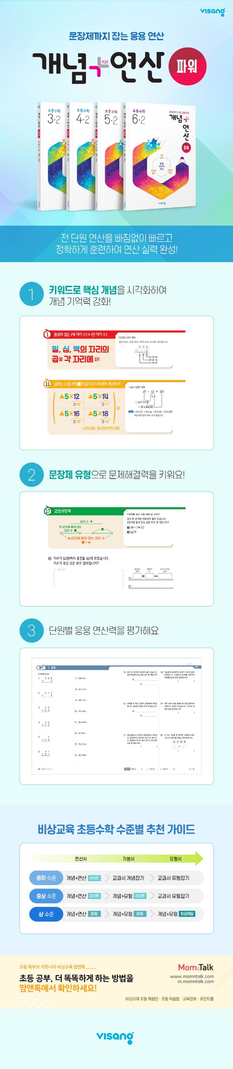 『개념+연산 파워』는 응용 개념을 키워드로 임팩트 있게 정리하고, ‘기본, 스킬, 문장제’ 단계별 연산 유형으로 응용 연산력을 기릅니다.