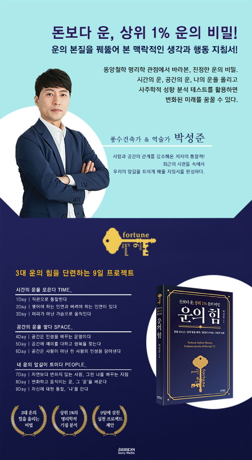 명리학의 천지인(天地人)을 근간으로 한 시간의 운, 공간의 운, 나의 운, 3가지 운의 힘을 올리는 비법을 9일의 실천으로 정리했다. 오행, 역학, 풍수를 유용한 도구로 활용하여 오늘의 나를 단련하고 준비하면 그 운의 힘은 더욱 더 길러질 수 있다. 누구나 인생을 살다 보면 오직 시간만이 지나가는 것을 기다릴 수밖에 없는 무기력한 순간을 겪게 마련이다. 그럴 때일수록 자신의 천성과 기질을 잘 파악하고 때를 기다리는 것, 그리고 정성을 다해서 좋은 공간을 만들면 어느새 운의 힘이 생기고 만들어져 하나하나 쌓이게 되어 세상 속에서 당당하게 행복해질 수 있게 된다.