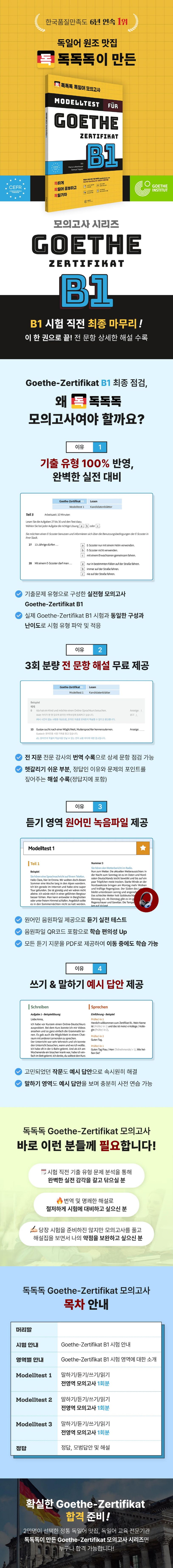 Goethe-Zertifikat B1시험 유형을 익히고 준비하는 데 도움을 주고자 제작되었다. 이 교재를 시험 직전에 유형을 파악하는 용도로 사용할 수도 있고, 혹은 시험에 응시하지 않더라도 자신의 실력이 어느 정도인지 확인하는 용도로 사용할 수도 있다. 본 교재는 크게 세 부분으로 나뉜다. 첫 번째 부분인 [응시 전에] 에는 전반적인 Goethe-Zertifikat B1 시험안내를 실었고, [Modelltests] 에는 실제 시험 유형에 맞는 모의고사 3회분을, 마지막에는 [정답]을 실었다.