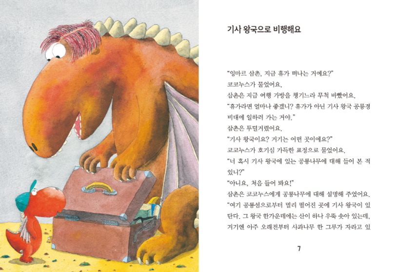 꼬마 공룡 코코누스가 기사 왕국으로 여행을 떠나기로 했어요. 공룡경비대에 일하러 가는 삼촌을 따라서요. 기사 왕국의 신성한 사과나무를 기사들로부터 지키기 위해서래요. 가장 친한 여자친구 마틸다도 함께 가기로 했지요.