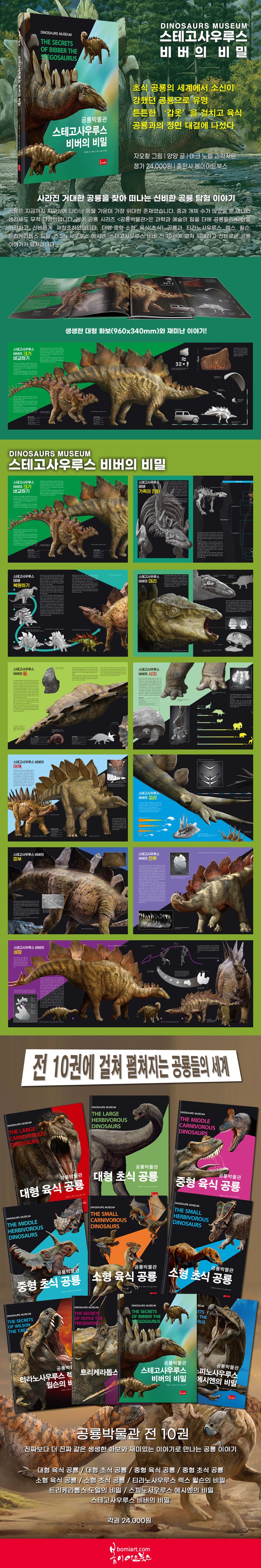 공룡은 지금까지 지구상에 나타난 동물 가운데 가장 위대한 존재였습니다. 종과 개체 수가 많았을 뿐 아니라 생김새도 무척 다양했답니다. 봄이 공룡 시리즈 〈공룡박물관〉은 과학과 예술의 힘을 더해 공룡들의 세상을 화려하고 신비롭게 재창조하였습니다. 대형·중형·소형 육식(초식) 공룡과 티라노사우루스 렉스 윌슨, 트리케라톱스 도일, 스피노사우루스 에시엔, 스테고사우루스 비버 전 10권에 걸쳐 위대하고 신비로운 공룡 이야기가 펼쳐집니다.