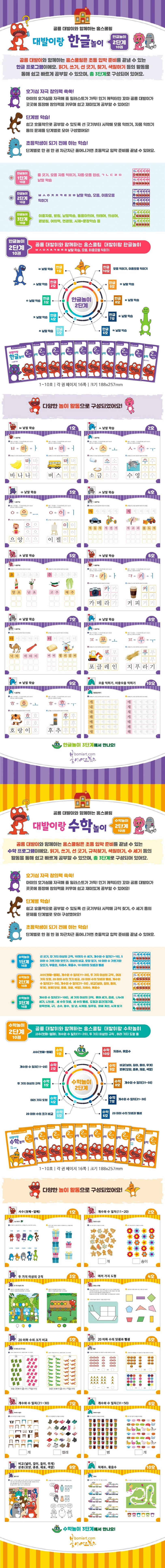 공룡 대발이와 함께하는 홈스쿨링은 초등 입학 준비를 끝낼 수 있는 한글·수학 프로그램이에요. 읽기, 쓰기, 선 긋기, 찾기, 색칠하기 등의 활동을 통해 쉽고 빠르게 공부할 수 있으며, 총 3단계로 구성되어 있어요.