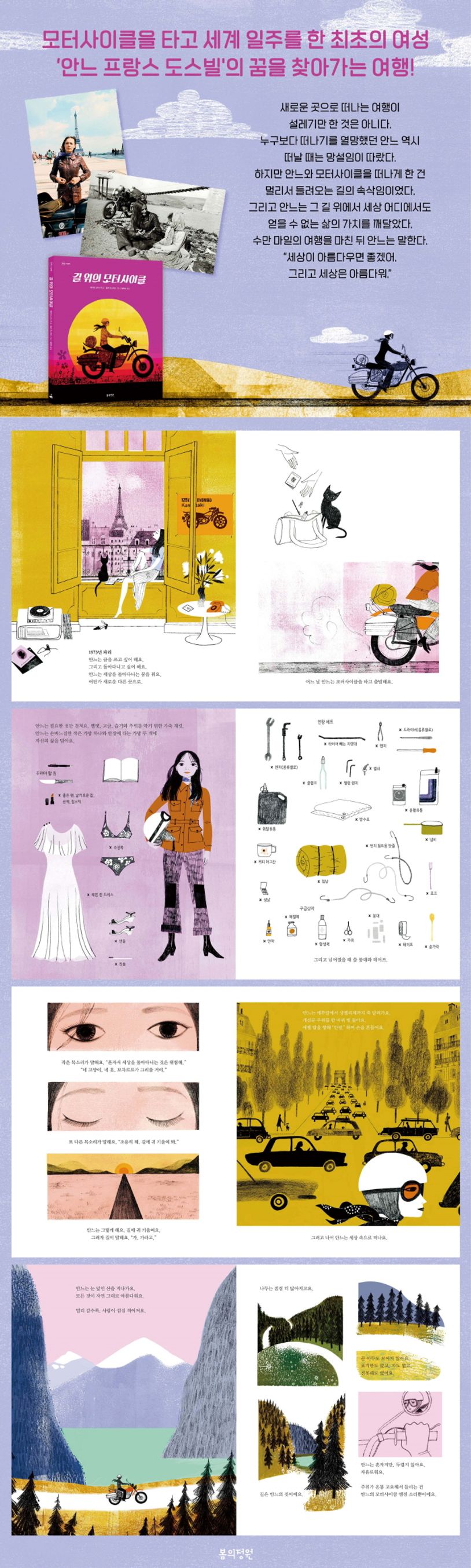 안느 프랑스 도스빌은 어딘가 멀리 새로운 곳으로 떠나기로 마음먹어요. 1973년 어느 날, 안느는 가죽 재킷을 입고, 헬멧을 쓰고, 모터사이클을 타고 출발했어요. 온갖 고비를 넘기며 달리고 달려 안느는 파리, 캐나다, 알래스카, 일본, 인도, 파키스탄, 아프가니스탄, 이란, 터키, 불가리아, 유고슬라비아 등을 거치며 세계 일주를 한 최초의 여성이 되었어요. 그리고 ‘세상’이라는 옷을 입고 집으로 당당히 돌아오지요. 그 멀고도 험한 여정 속에서 안느는 어떤 세상을 만났을까요?