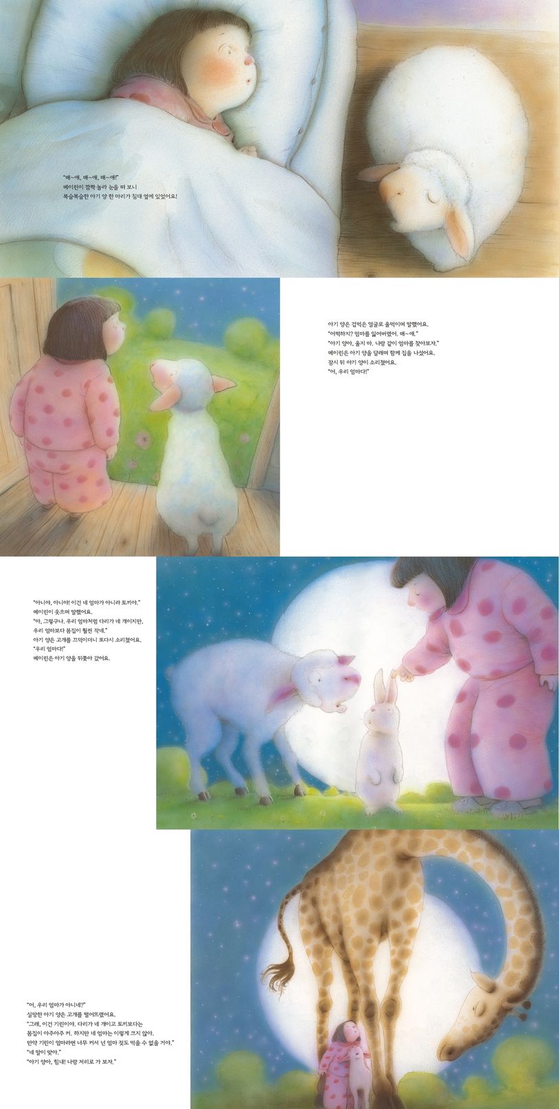 아기 양의 엄마를 찾아 집을 나선 메이린과 아기 양의 모험은 처음부터 만만치 않아요. 둘은 희망을 안고 저 멀리 있는 동물을 향해 뛰어가 보지만 번번이 아기 양의 엄마와 다르다는 것을 알게 되지요. 몸집이 훨씬 작은 토끼, 키가 너무 큰 기린, 얼룩무늬 털을 가진 젖소, 물고기를 먹는 북극곰, 울음소리가 다른 흰 말을 만났기 때문이에요. 메이린은 각각의 동물들이 아기 양의 엄마와 닮은 구석이 있기는 해도 아기 양의 엄마가 아닌 이유를 아기 양에게 친절하게 설명해 주었어요. 다리가 4개, 너무 크지도 작지도 않은 몸집, 복슬복슬한 흰 털, 풀을 먹는 동물 등 엄마의 특징을 논리적으로 짚어 나가는 동안 양의 특징뿐 아니라 다른 동물의 특징을 퀴즈를 풀어 나가듯이 하나씩 알아가게 되었어요. 한창 사물과 동물에 관심이 많은 이 시기의 아이들에게 동물의 특성까지도 함께 알려 주고 있지요.