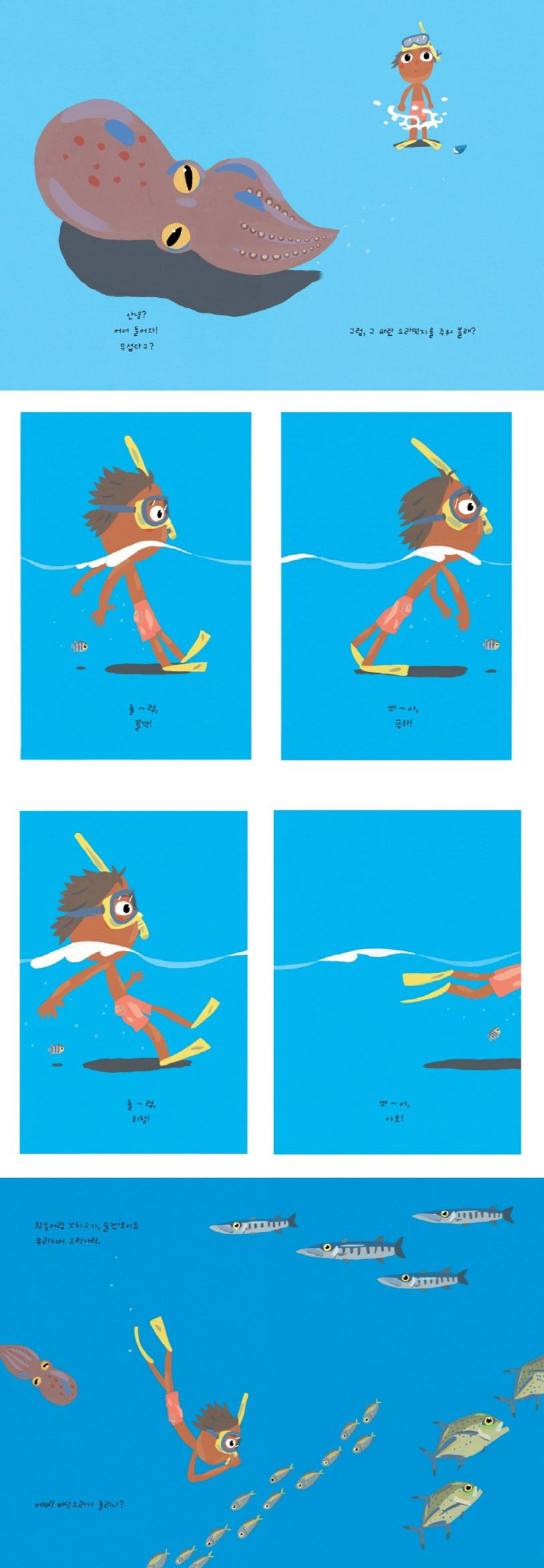 어느 여름 바닷가, 두 주먹을 꽉 쥔 채 깊은 생각에 잠겨 있는 소년이 있습니다. 그때, 고래만큼이나 커다란 문어가 물위에 반쯤 눈을 드러낸 채 소년에게 말을 걸지요. "안녕? 어서 들어와! 무섭다고? 흐흐" 왠지 음흉하게만 보이는 문어는 예쁜 소라딱지로 소년을 유혹하면서 물속으로 끌어들입니다. 소년은 눈을 깜빡이며 문어를 따라 점차 깊은 물속으로 빨려 들지요. 어느새 바닷물은 허리에서 가슴으로, 가슴에서 목울대로 차오릅니다. 그러다 어느 순간 깊은 바닷속으로 몸이 쑤욱 빨려 들어갑니다. 바닷속에는 정말 별별 생물들이 많아요. 갯민숭달팽이, 흰동가리, 말미잘, 성게ㆍㆍㆍ. 소년은 문어의 안내를 받으며 어느덧 물속 세계에 푹 빠져듭니다.