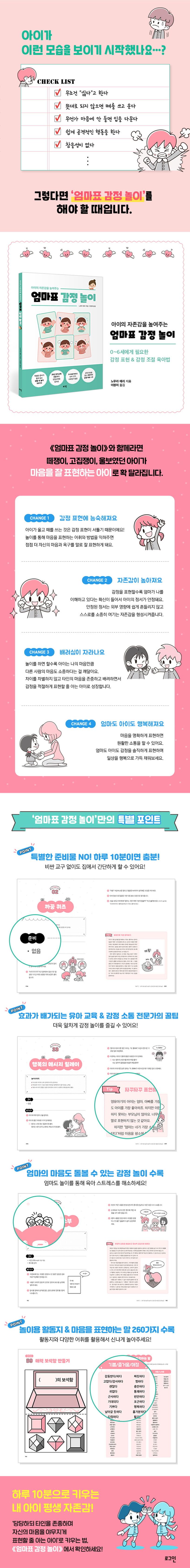 아이의 기분을 잘 알고 싶고, 또 알아야 할 사람은 다름 아닌 엄마다. 하루 10분, 이 책에 실린 놀이를 통해 아이의 마음을 살피고 이해하는 시간을 가져보자. 엄마에게 자신의 감정을 솔직하게 드러내고 표현했던 순간들은 아이의 자존감 형성의 밑거름이 될 것이다.