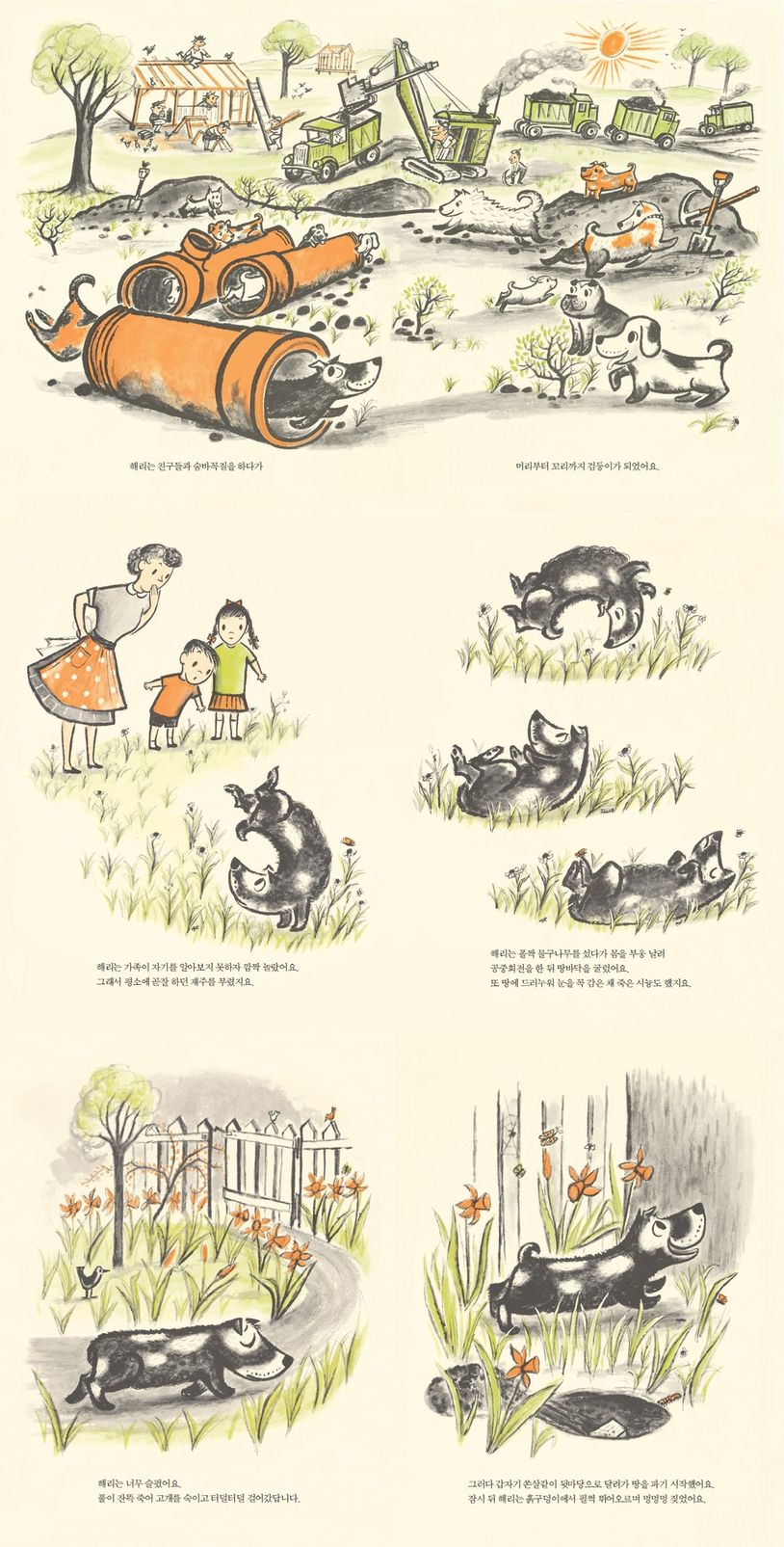 목욕하기 싫은 개구쟁이 해리의 이야기 〈개구쟁이 해리-목욕은 정말 싫어요〉는 책을 읽는 내내 아이와 엄마의 기분을 유쾌하게 하는 그림책이에요. 약간은 엉뚱하면서도 천진난만한 주인공 해리는 우리 아이들의 모습과 많이 닮아 입가에 미소가 번지고, 마음이 포근해지는 주인공 강아지랍니다. 아이들에게는 목욕하기 싫어서 집 밖으로 도망치고 온몸이 시커매질 때까지 신나게 뛰어 노는 해리가 친구처럼, 혹은 마치 자기 자신처럼 느껴질 거예요.