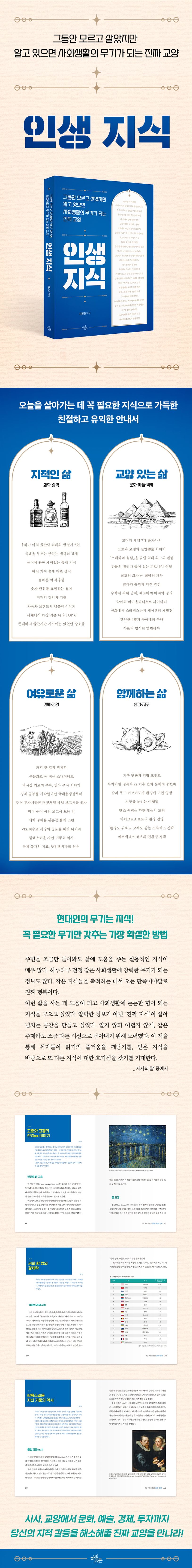 이 책 《인생 지식》은 만만치 않은 일상에서 작은 즐거움이 되는 정보와 깨알 같은 같은 지식으로 가득 찬 교양 입문서다. 1600년대 초반 튤립 구근 하나가 집 한 채 값에 육박했던 이유에서 스타벅스 커피 한 컵에 숨은 경제 이야기, 전 세계인이 즐겨먹는 아보카도가 환경 파괴의 주범으로 몰린 이유 등 지적 호기심을 자극하는 주제들이 흥미를 끈다. ‘그동안 모르고 살았지만 알고 있으면 사회생활의 무기가 되는 진짜 교양’이라는 부제가 말해주듯 좀 더 나은 삶을 영위하고, 내일을 위해 한 발 더 내딛게 하는 데 도움이 되는 정보들이다.