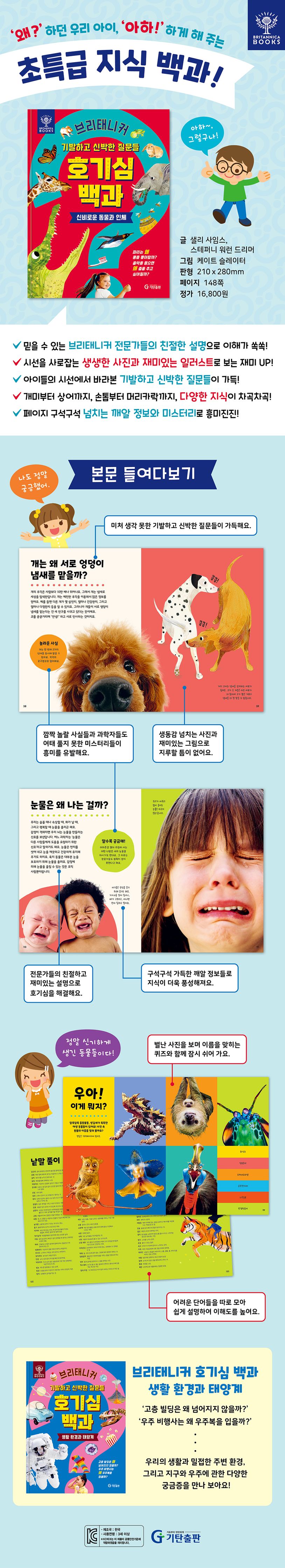 아이들은 질문이 참 많기도 해요. 밥을 먹다가도, 신나게 놀다가도, 심지어 잠자리에 누워서도 쉬지 않고 질문해요. 아이들의 질문 중에는 어른들은 미처 생각도 못할 만큼 엉뚱한 것들도 있어 말문이 막히기도 한답니다. 유아는 대개 4-5세에 접어들면서 호기심이 왕성해지고, 세상의 모든 것이 궁금해지기 시작해요. 『브리태니커 호기심 백과』는 바로 이러한 아이들을 위한 똑 부러지는 지식 백과예요. 250년의 오랜 세월 동안 전 세계인들의 궁금증을 해결해 준 ‘브리태니커 백과사전’ 전문가들이 이번에는 아이들의 눈높이에 맞춰 엉뚱한 질문들에 친절하고 재미있게 답해 줍니다. 언제나 ‘왜?’라고 묻던 우리 아이가 『브리태니커 호기심 백과』와 함께라면 ‘아하!’ 하며 고개를 끄덕일 거예요.