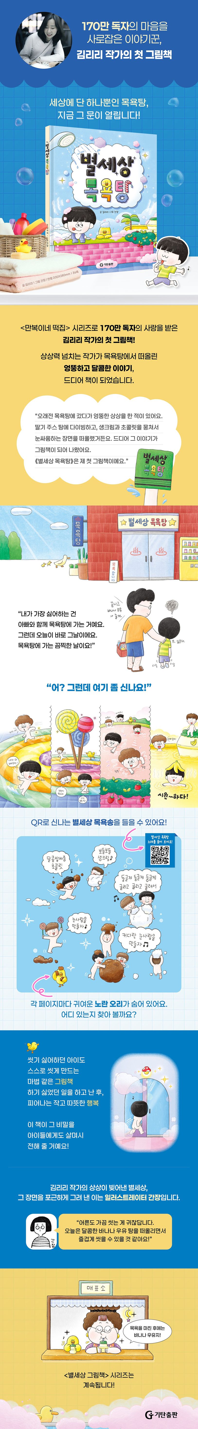 《별세상 목욕탕》은 〈만복이네 떡집〉 시리즈의 김리리 작가와 귀엽고 개성 넘치는 그림을 그리는 간장 작가의 첫 콜라보 그림책이에요. 김리리 작가가 만들어 낸 ‘별세상 목욕탕’이라는 가상의 공간을 간장 작가가 생기 넘치는 환상적인 모습으로 표현했어요. 책장을 넘기다 보면 등장하는 딸기 주스 탕부터 생크림 탕까지 남녀노소 가리지 않고 모두 뛰어들고 싶어질 거예요. 씻는 것을 가장 싫어하는 아이라도 별세상 목욕탕에 가게 되면 씻지 않고는 못 배길걸요! 책 중간에는 ‘별세상 목욕탕’ 주제곡도 담겨 있어요. 다 함께 별세상 목욕탕에 방문해 볼까요? 흥얼흥얼 노래도 부르면서 말이에요!