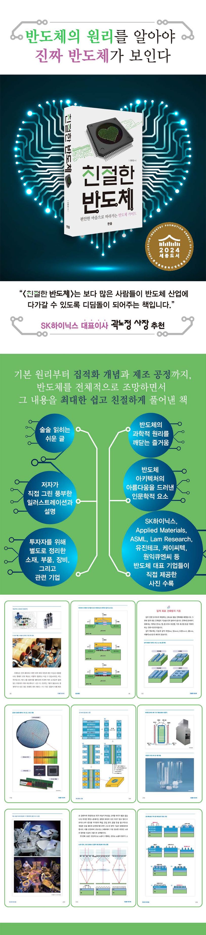 반도체의 기본 원리부터 집적화 개념, 제조 공정까지 전체적으로 조망하면서 그 내용을 최대한 쉽고 친절하게 풀어낸 책.
