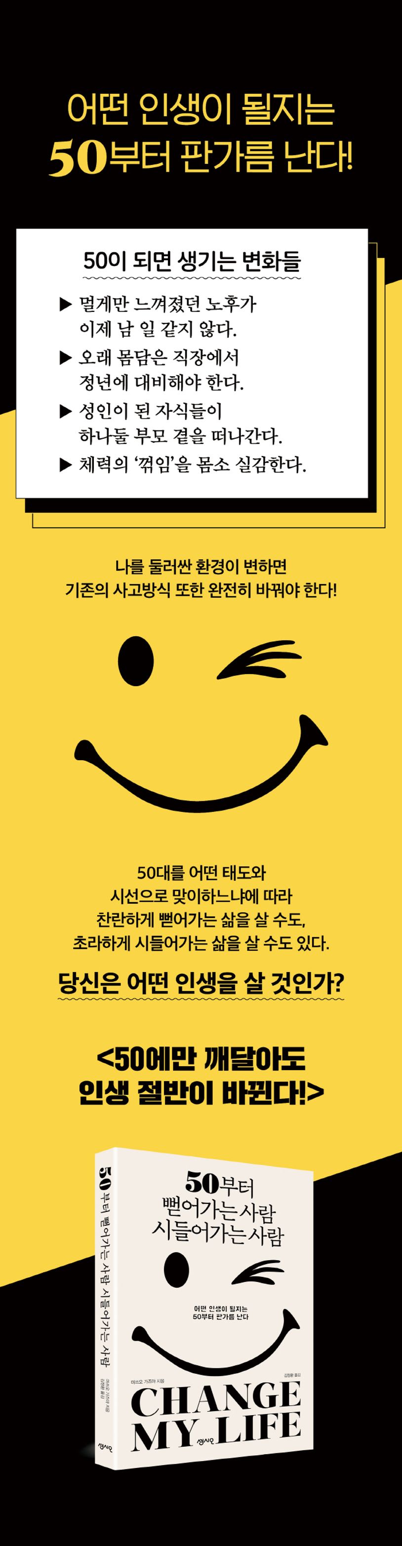 저자는 말한다. 어떤 인생을 맞이할지는 각자의 선택에 달린 일이며, 50에는 누구든 그 선택을 하게 된다고. 어떤 인생이 될지는 50부터 판가름 난다고.