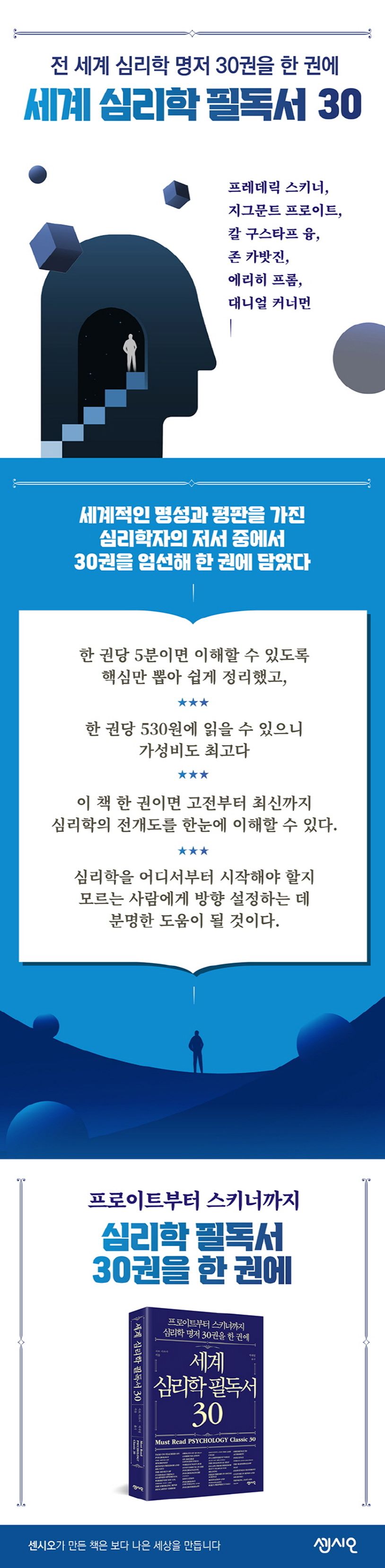 세상은 나와 타인으로 이루어져 있고 심리학은 인간(Human Being)의 마음을 다루기에 인간과 가장 가까이에 있는 학문이지만 막상 접해보면 복잡하고 심오해 쉽지 않다. 수많은 책 중에 어떤 책을 읽어야 할지 판단하기도 어렵고 수십 권씩 읽을 시간도 없다. 이런 현실적 문제를 해결해 주는 책이 바로 〈세계 심리학 필독서 30〉 이다. 수많은 저자의 책 중에서 분명한 기준으로 필독서 30권을 엄선해 한 권으로 정리했기 때문이다.
