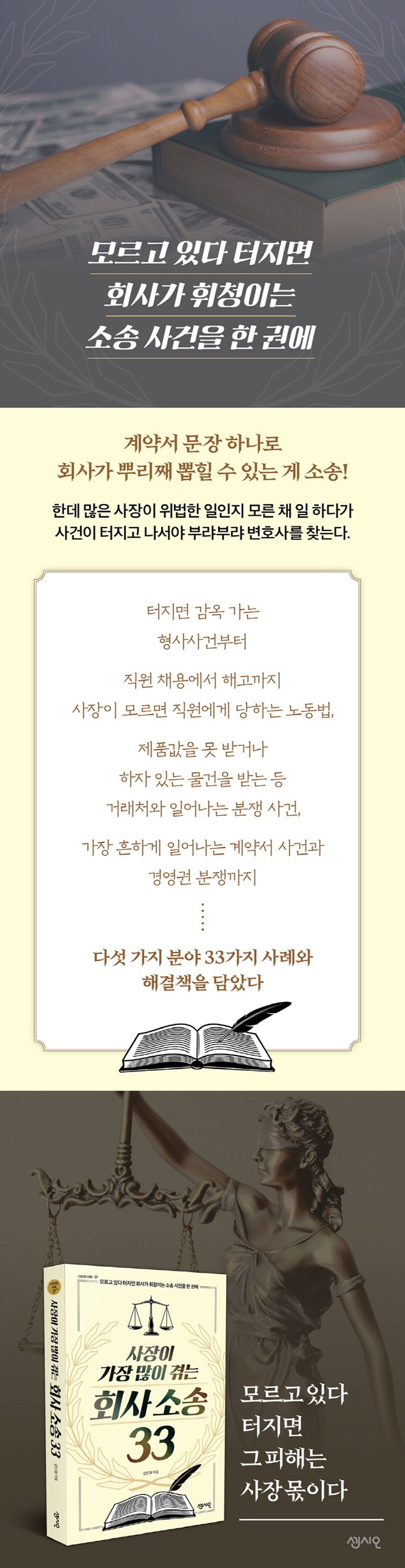 사장이 회사를 운영하면서 가장 많이 겪게 되는 소송 33가지를 한 권에 담은 책이 출간됐다. 기업소송 전문 변호사인 저자는 계약서 문장 하나로 회사가 뿌리째 뽑힐 수도 있고 형사사건이 터지면 감옥에도 갈 수 있는 게 소송이라며, 사장이라면 회사에서 자주 일어나는 소송 사례는 알아두는 게 큰 손해를 막는 길이라고 주장한다. 알면 미리 준비할 수 있고 일이 생겨도 대처할 수 있지만 모르고 있다 터지면 그 피해는 사장 몫이기 때문이다.