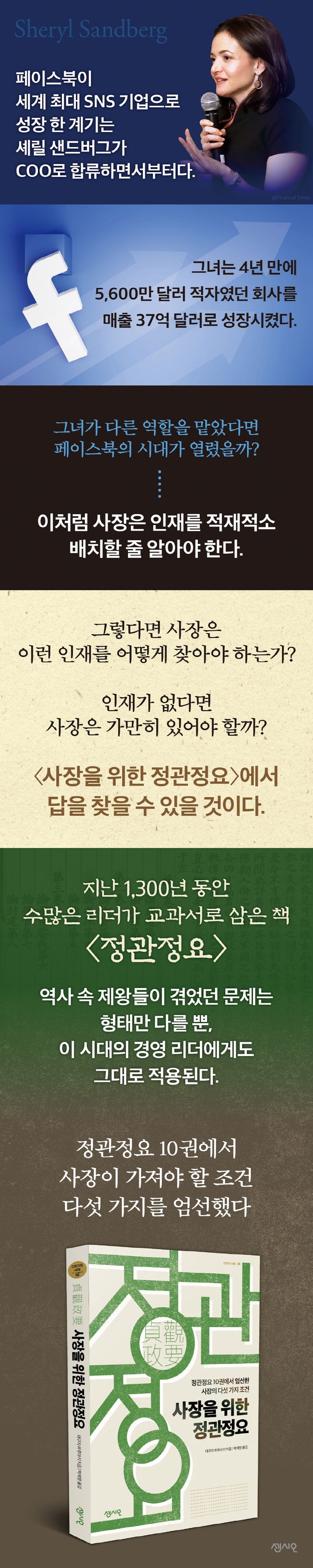 제왕학의 교과서로 불리는 정관정요는 지난 1,300년 동안 수많은 리더가 교과서로 삼은 책이다. 저자는 역사 속 제왕들이 겪었던 문제는 형태만 다를 뿐, 이 시대의 경영 리더에게도 그대로 적용된다고 말하며, 그들이 고민했던 문제의 해결책이 담긴 〈정관정요〉에서 사장의 조건만 뽑아 현대 비즈니스 상황을 사례로 들어 쉽게 풀어냈다.