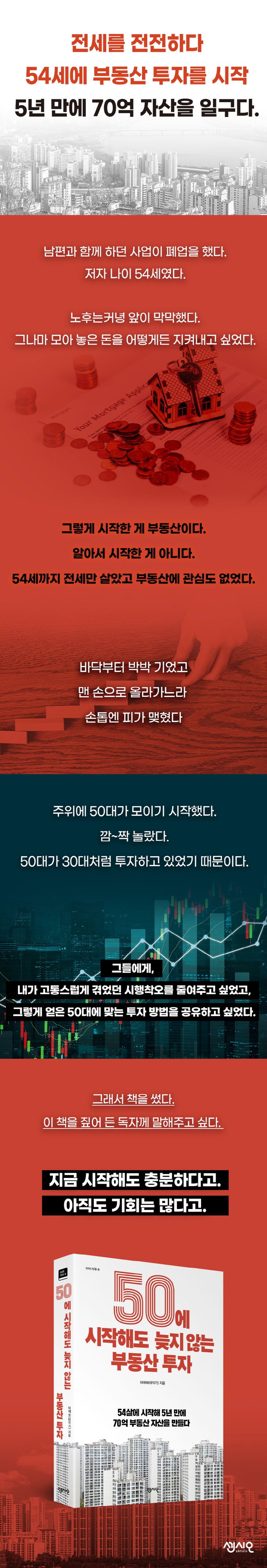 저자는 자신이 고통스럽게 겪었던 시행착오를 줄여주고 그렇게 깨달은 50대에 맞는 부동산 투자를 공유하고 싶어 책을 썼다고 말한다. 부동산 정보를 찾는 법부터 70억 원 자산을 불린 과정, 50대에 맞는 잃지 않는 부동산 투자 원칙을 하나도 빼지 않고 넣었다.