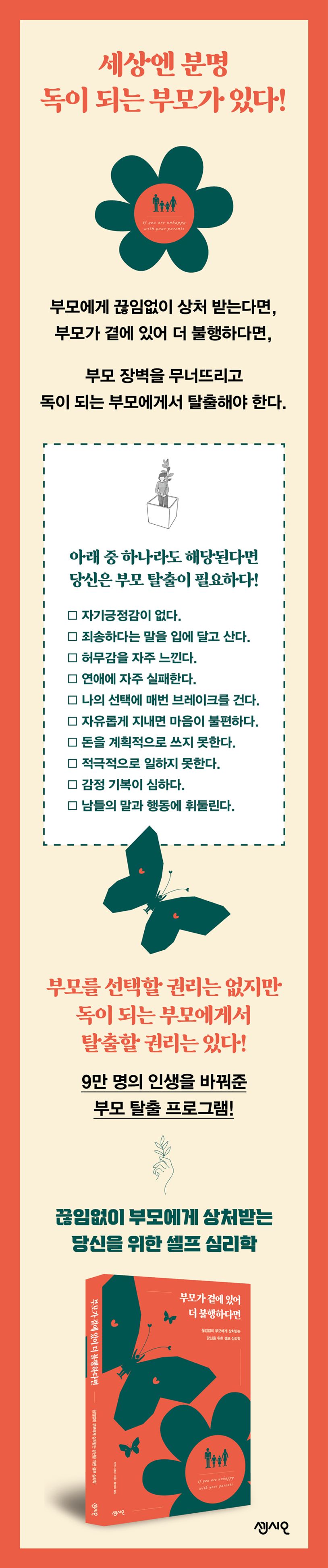 끊임없이 부모에게 상처받고 있다면, 독이 되는 부모에게서 심리적으로 탈출해야 원하는 삶을 살 수 있다고 주장하는 책 〈부모가 곁에 있어 더 불행하다면〉이 출간됐다. 부모-자녀 관계 전문가인 저자가 부모와의 관계로 힘들어하는 9만 명의 인생을 바꾸어준 ‘부모 탈출’ 프로그램의 핵심 내용과 사례를 담은 책이다.