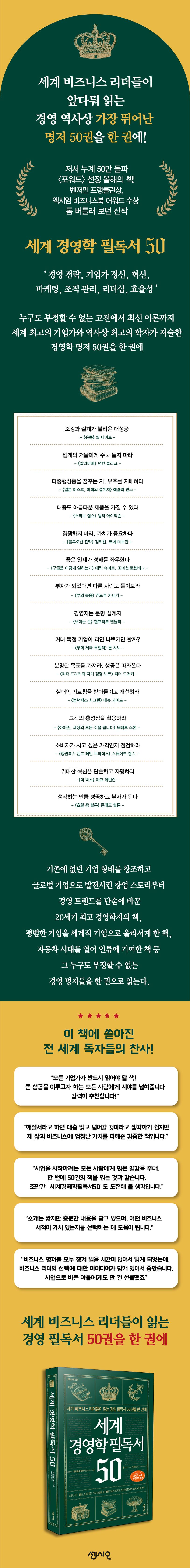 경영 역사상 가장 중요한 명저 50권을 한 권에 정리한 책 《세계 경영학 필독서 50》이 출간됐다. 세계적 기업을 일군 기업가부터 역사상 가장 뛰어난 경영학자와 경영 트렌드를 바꾼 저자들의 책 중에서 명저 50권을 선정해 핵심 내용만 쉽게 정리한 책이다.〈포워드〉선정 올해의 책, 엑시엄 비즈니스북 워어드, 벤저민 프랭클린상을 수상한 톰 버틀러 보던의 필독서 시리즈이며, 50만 독자가 그 영광을 함께했다.