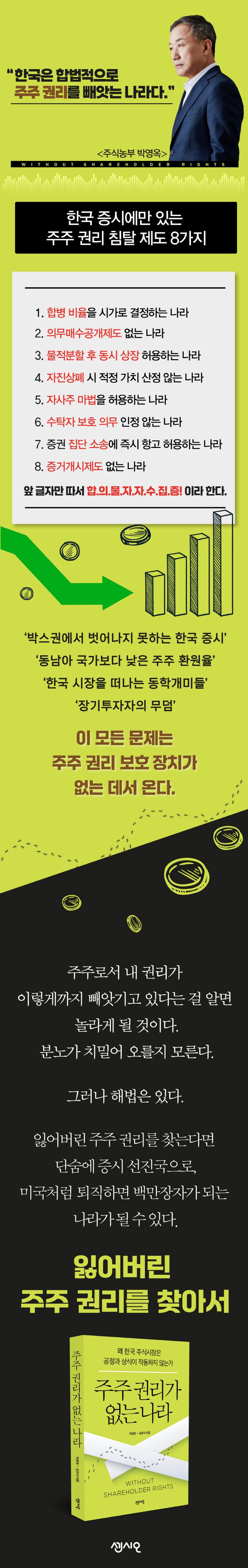 대한민국 대표 투자자 주식농부 박영옥과 한국기업거버넌스포럼 김규식회장의 신간이 출간됐다. 〈주주 권리가 없는 나라〉다. 저자는 이번 책에서 한국은 합법적으로 주주의 이익을 침탈하는 나라라고 말한다. 일반 주주의 뒤통수를 치는 물적분할 후 동시상장부터, 기업의 이익을 빼돌리는 터널링, 불합리한 합병 비율, 자진상폐 등 선량한 주주 권리를 빼앗는 사례가 끊임없이 일어나고 있기 때문이다. 그로 인해 동학 개미는 한국 증시를 떠나가고, 주가는 박스권에 갇혀있다고 말한다. 왜 한국 주식 시장은 이런 일이 반복되는 걸까? 해법은 없는 걸까?