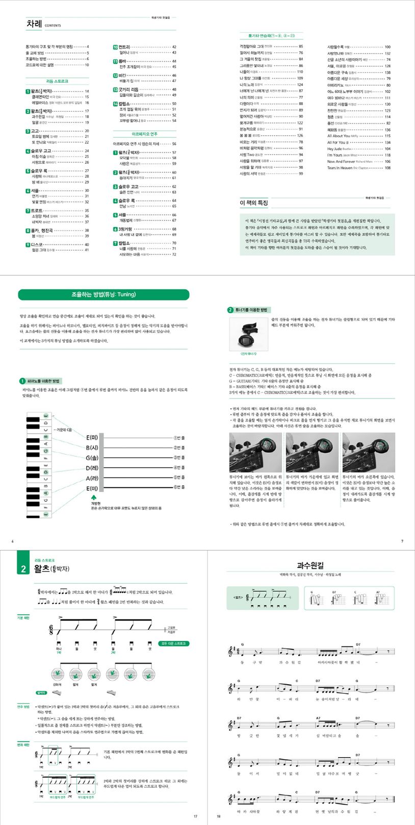1. 통기타에 음악에서 자주 사용되는 리듬 스트로크 패턴과 아르페지오 패턴이 수록되어 있습니다.