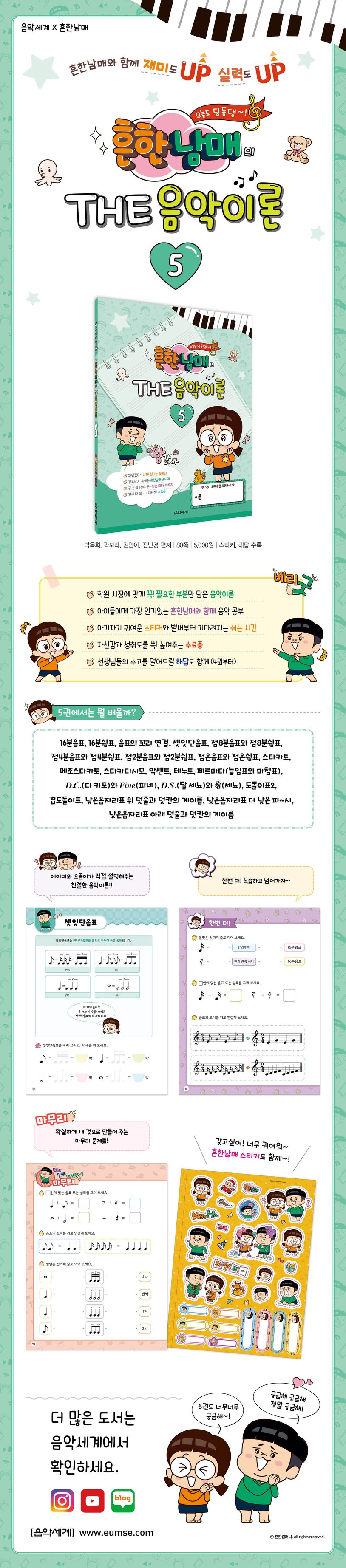 흔한남매와 함께하는 기초 음악이론 교재입니다. 아이들이 쉽게 이해할 수 있도록 흔한남매 캐릭터를 활용한 친절한 설명과 각 챕터별로 개념을 확실히 잡아 줄 복습 페이지를 수록했으며 아이들이 좋아하는 귀여운 흔한남매 스티커와, 놀이 페이지로 더욱 흥미롭게 공부할 수 있습니다. 전12권에 걸친 교재로 4권부터는 해답도 함께 수록하였습니다.