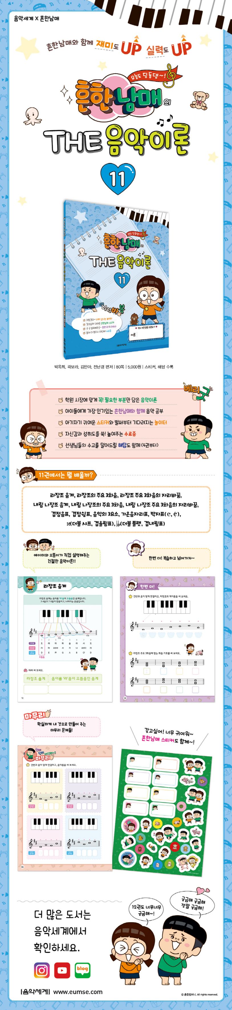 흔한남매와 함께하는 기초 음악이론 교재입니다. 아이들이 쉽게 이해할 수 있도록 흔한남매 캐릭터를 활용한 친절한 설명과 각 챕터별로 개념을 확실히 잡아 줄 복습 페이지를 수록했으며, 아이들이 좋아하는 귀여운 흔한남매 스티커와 놀이 페이지로 더욱 흥미롭게 공부할 수 있습니다. 전12권에 걸친 교재로 4권부터는 해답도 함께 수록하였습니다.