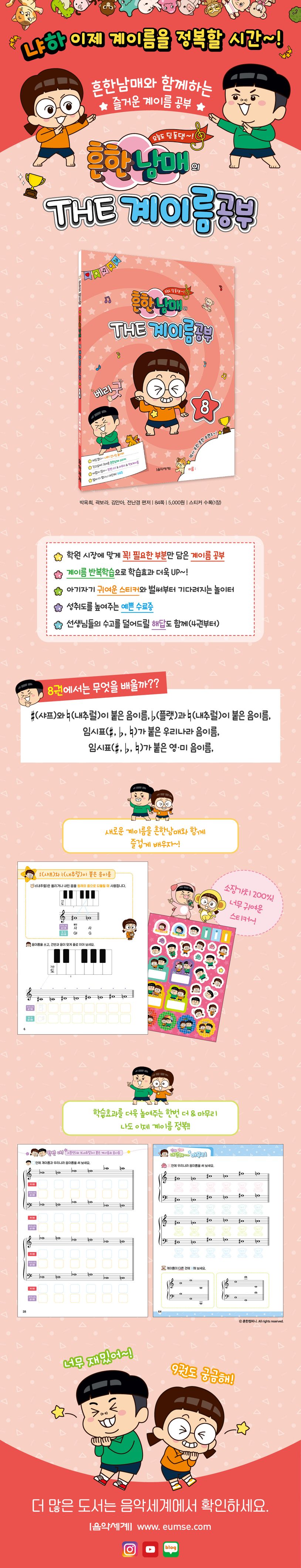 흔한남매와 함께하는 기초 계이름 공부 교재입니다. 간단한 음악이론과 함께 계이름을 배우고, ‘한번 더!’, ‘마무리’, ‘악보 계이름’를 통해 반복 학습하며 학습효과를 더욱 높일 수 있도록 구성하였습니다. 아이들이 좋아하는 귀여운 흔한남매 스티커와 ‘놀이터’ 페이지로 더욱 흥미롭게 공부할 수 있습니다. 총 12권으로 분권하여 계이름을 학습할 수 있고, 4권부터 수록된 해답으로 선생님들의 편의성도 더욱 높였습니다.