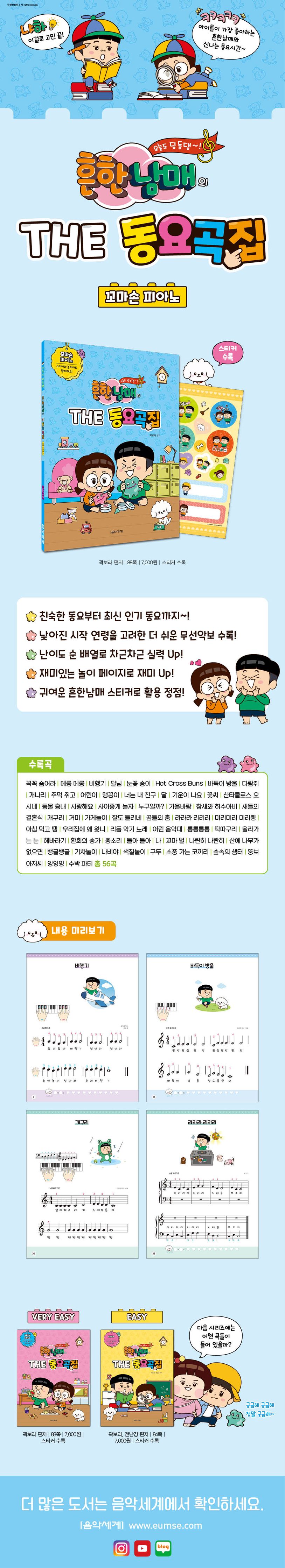 요즘 아이들이 가장 사랑하는 흔한남매와 동요곡집이 만났다! 『흔한남매의 THE 동요곡집 꼬마손 피아노』는 바이엘 초반부터 중반 난이도의 학습자를 위한 병용 연주곡집입니다. 단계별로 총 3권으로 구성되어 있으며, 가독성 좋은 큰 악보와 아이들이 쉽고 재밌게 배울 수 있는 곡들로 엄선하여 수록하였습니다. 놀이 활동 페이지와 어디서나 자유롭게 활용 가능한 귀여운 스티커까지 삽입하여 연주와 더불어 아이들의 흥미도 높이고 실력도 Up 시키는 활용도 높은 동요곡집입니다.