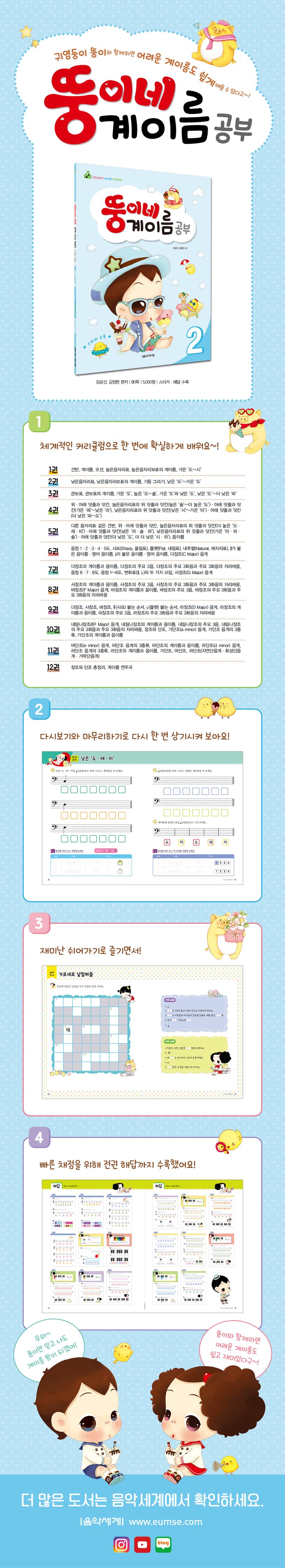 〈뚱이네 계이름 공부〉는 귀여운 뚱이네 캐릭터와 함께하는 기초 계이름 공부 교재입니다. 체계적인 커리큘럼으로 구성되어, 각 권당 한 번씩만 풀어도 계이름을 익힐 수 있습니다. 다양한 문제 형식으로 이뤄진 ‘다시 보기’와 ‘마무리하기’를 통해 반복 학습을 할 수 있으며, 지루하지 않도록 재미난 ‘쉬어가기’로 아이들의 흥미를 유발하였습니다. 또한, 총 12권 전권에 수록된 해답으로 선생님들의 편의성도 더욱 높였습니다.