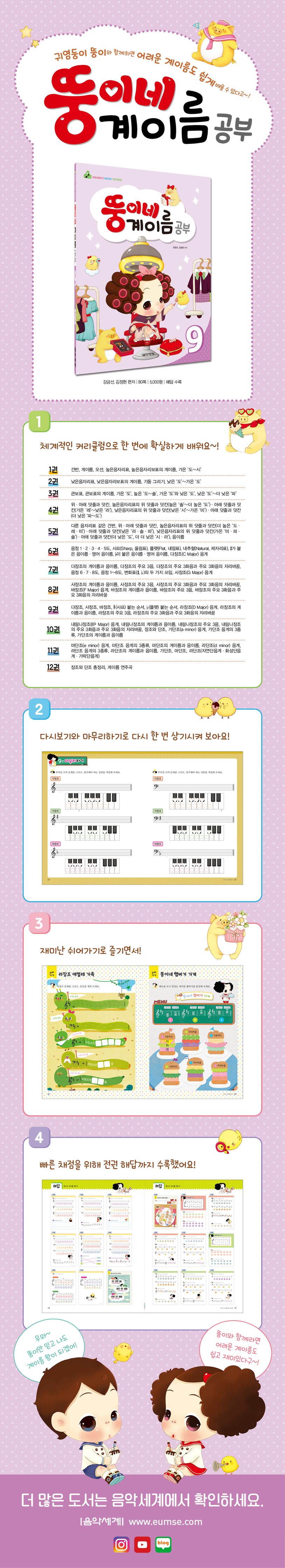 〈뚱이네 계이름 공부〉는 귀여운 뚱이네 캐릭터와 함께하는 기초 계이름 공부 교재입니다. 체계적인 커리큘럼으로 구성되어, 각 권당 한 번씩만 풀어도 계이름을 익힐 수 있습니다. 다양한 문제 형식으로 이뤄진 ‘다시 보기’와 ‘마무리하기’를 통해 반복 학습을 할 수 있으며, 지루하지 않도록 재미난 ‘쉬어가기’로 아이들의 흥미를 유발하였습니다. 또한, 총 12권 전권에 수록된 해답으로 선생님들의 편의성도 더욱 높였습니다.