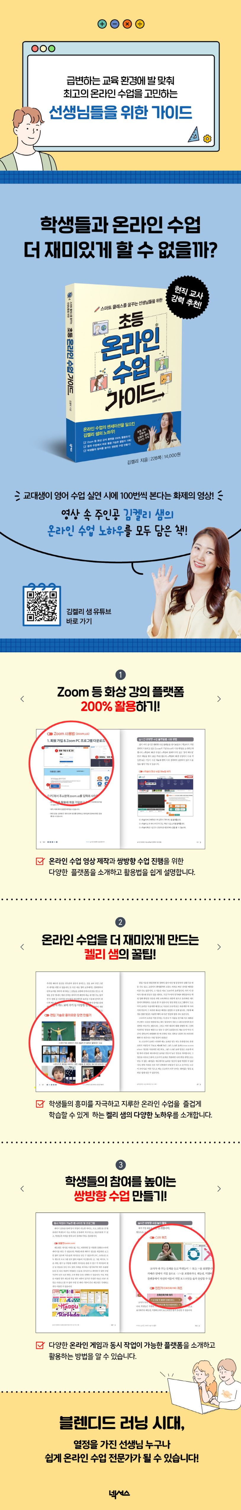 코로나로 인해 급변하는 교육 환경에 적응해야만 하는 초등학교 선생님들을 위한 온라인 수업 가이드가 되는 책이다. MZ 세대 초등 교사 유튜버인 김켈리 선생님의 수업 준비와 각종 장비를 다루는 정보 등 선생님만의 팁을 공유한다. 온라인 수업 왕초보도 누구나 쉽게 바로 따라 할 수 있고, 이론보다는 실제 경험을 바탕으로 한 실전 팁 위주 구성되어 있다. 온라인 수업에서도 어린 학생들의 집중력을 높이고 활발히 상호작용할 수 있는 다양한 방법들을 소개한다. 수업을 좀 더 흥미롭고 재미있게 만드는 김켈리 선생님만의 독보적이고 차별화된 비법이 담겨있다.