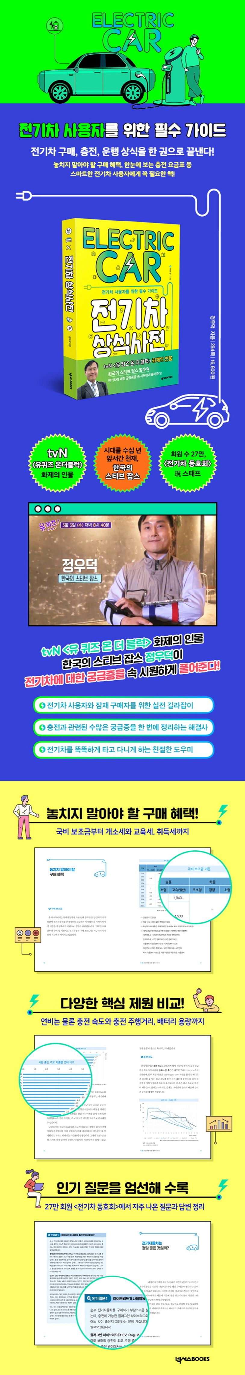 전기자동차의 각종 제원 비교부터, 장단점, 구매 혜택, 충전과 결제 방법, 카드사별 혜택, 다양한 지원금과 할인 혜택, 소모품과 배터리, 액세서리 관리법, 회생제동과 공조 장치가 연비에 미치는 영향 등 그야말로 전기자동차의 교과서이자, A to Z가 모두 들어있다 해도 과언이 아니다. 전기자동차에 관심이 있거나, 구매 예정이거나, 현재 타고 있다면 꼭 한 번쯤 읽어야 할 도서이다.